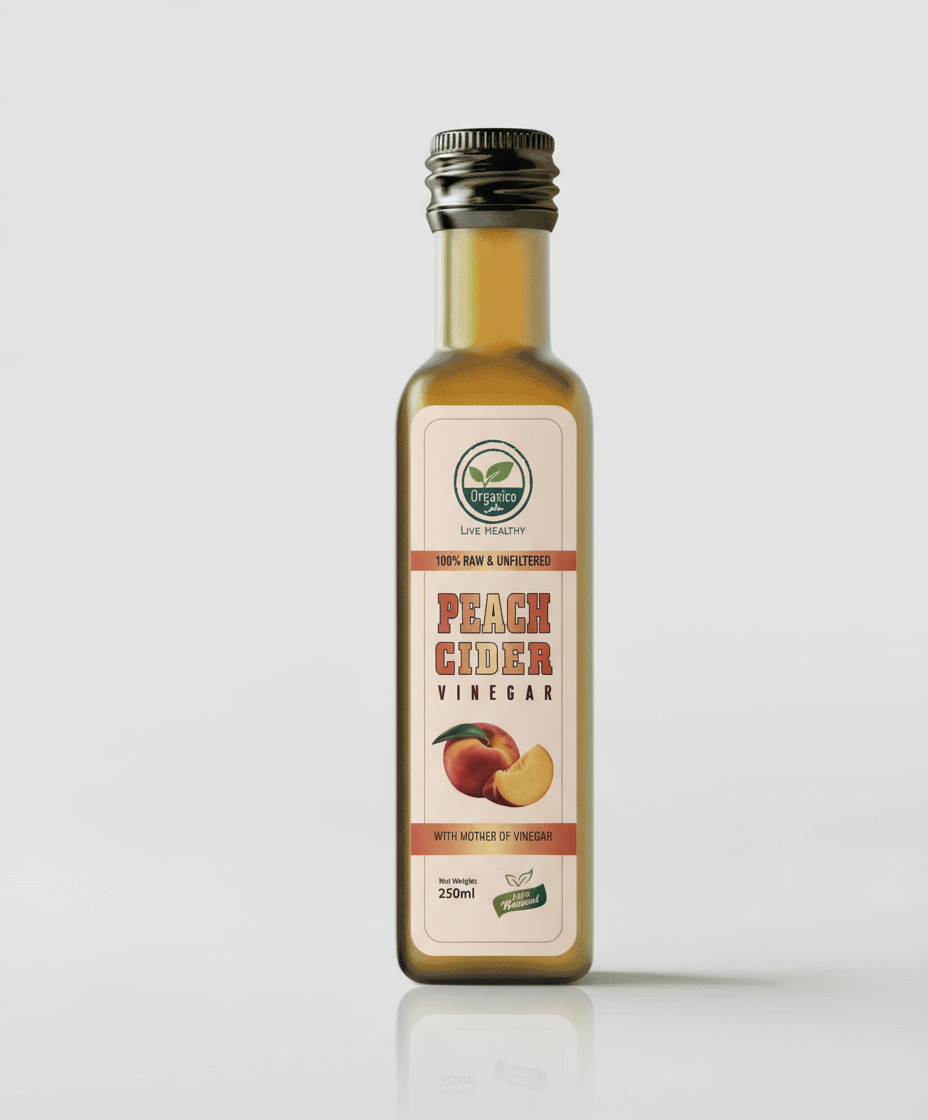 Organico Peach Cider Vinegar is a natural fruit-based vinegar made from fresh, ripe peaches grown using clean, chemical-free methods. It is raw, unfiltered, and unpasteurised, with the live mother culture that provides enzymes, proteins, and gut-friendly bacteria.