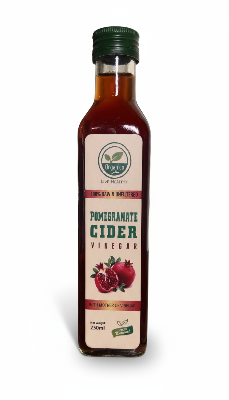 Pomegranate Cider Vinegar is made from fresh, ripe pomegranates that go through a slow and natural fermentation process. This process keeps the vinegar raw, unfiltered, and unpasteurized, so it retains the live “mother” – a natural mix of proteins, enzymes, and beneficial bacteria that support gut health and digestion. It delivers a clean, tangy taste with all the nutrients that make pomegranates one of the most valued fruits for health.